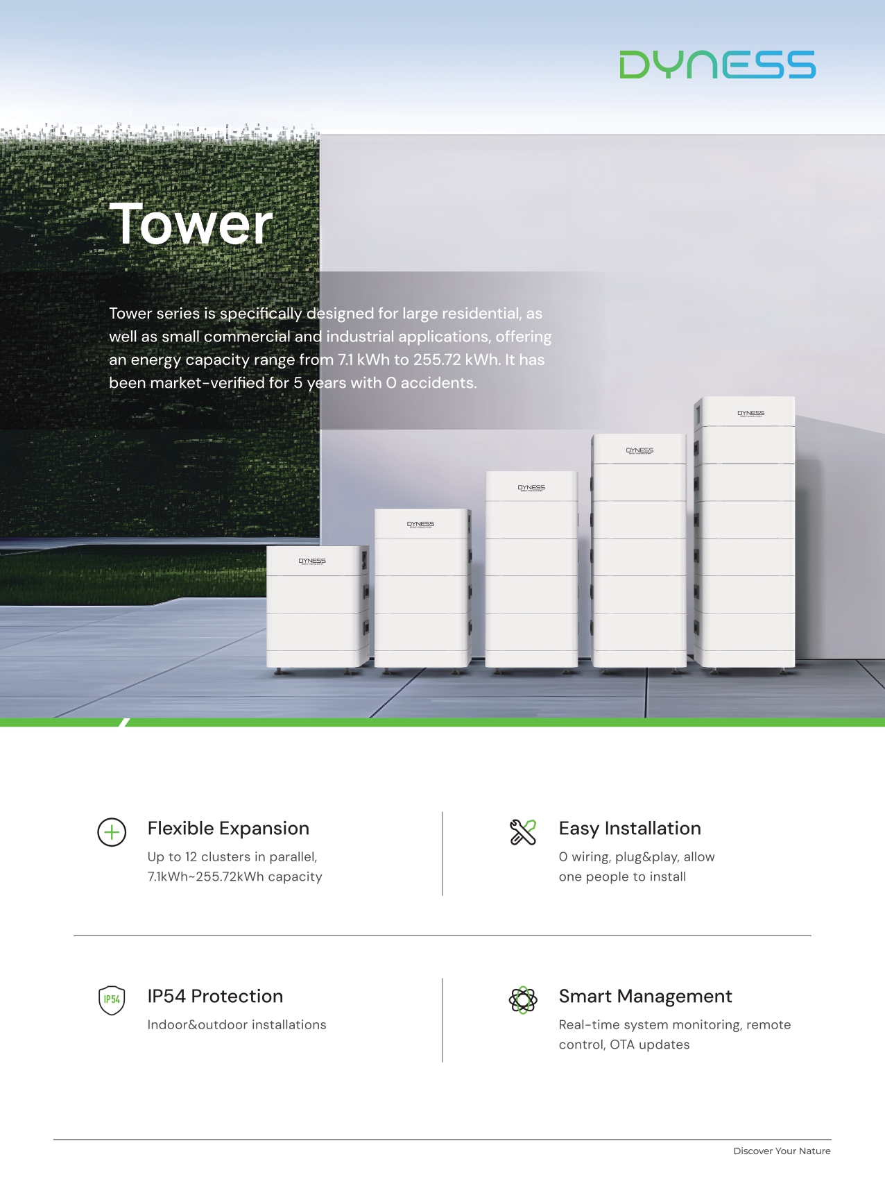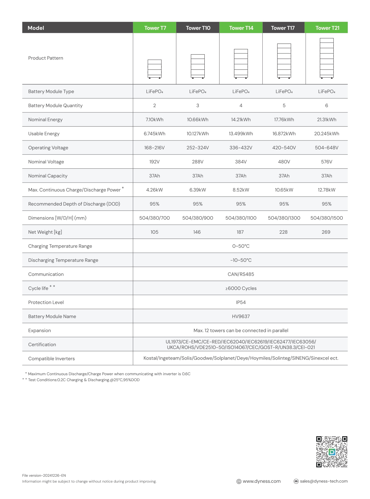 Der Dyness Tower ist ein Hochspannungs-Energiespeichersystem auf Basis der von Dyness entwickelten LiFePO4-Batterien. Er wird zur kontinuierlichen und zuverlässigen Stromversorgung aller Arten von elektrischen Geräten und Anlagen eingesetzt. Er ist besonders geeignet für höhere Leistungslasten bei begrenztem Bauraum. Sie verfügt über ein Batteriemanagementsystem (BMS) mit Schutz vor Überentladung, Überladung, Überstrom und zu hohen oder zu niedrigen Temperaturen. Es verwaltet automatisch den Lade- und Entladestatus und gleicht Strom und Spannung der einzelnen Zellen aus. Die Module können in Konfigurationen von 2 bis 6 Einheiten und den Bausatzbezeichnungen T7, T10, T14, T17, T21 kombiniert werden.