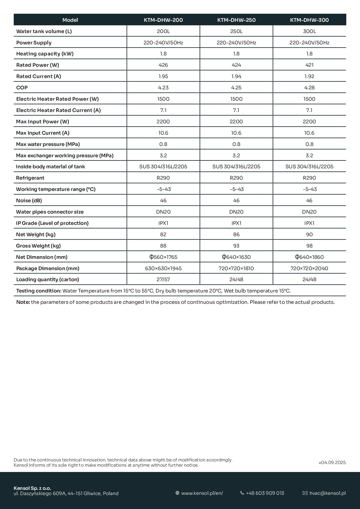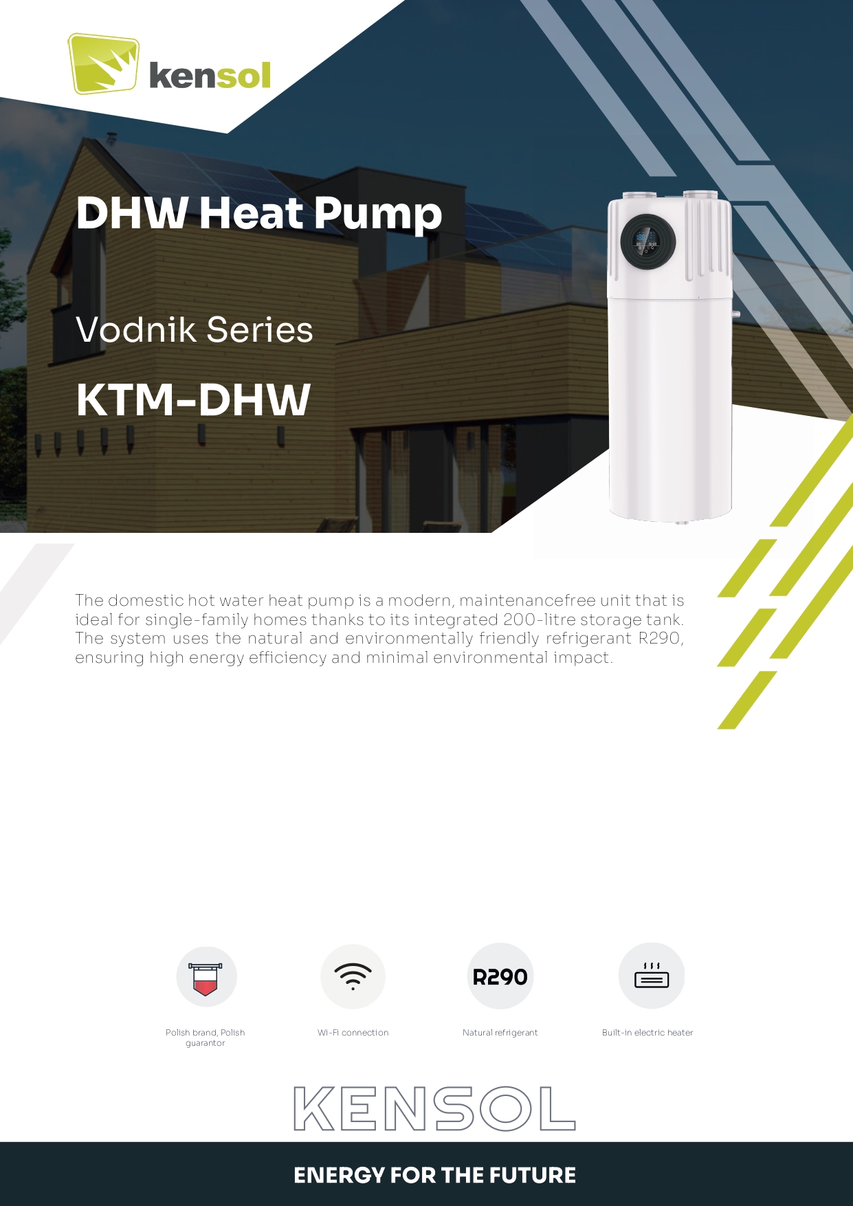 Die Warmwasser-Wärmepumpe Kensol KTM-DHW (Vodnik 300 l) ist ein modernes System zur Warmwasserbereitung, das Energie aus der Luft nutzt und den Stromverbrauch im Vergleich zu herkömmlichen Elektroboilern deutlich senkt. Das Gerät mit der Bezeichnung KTM-DHW-300 wurde für Einfamilienhäuser und kleine Gewerbeobjekte entwickelt und bietet hohen Warmwasserkomfort bei niedrigen Betriebskosten.