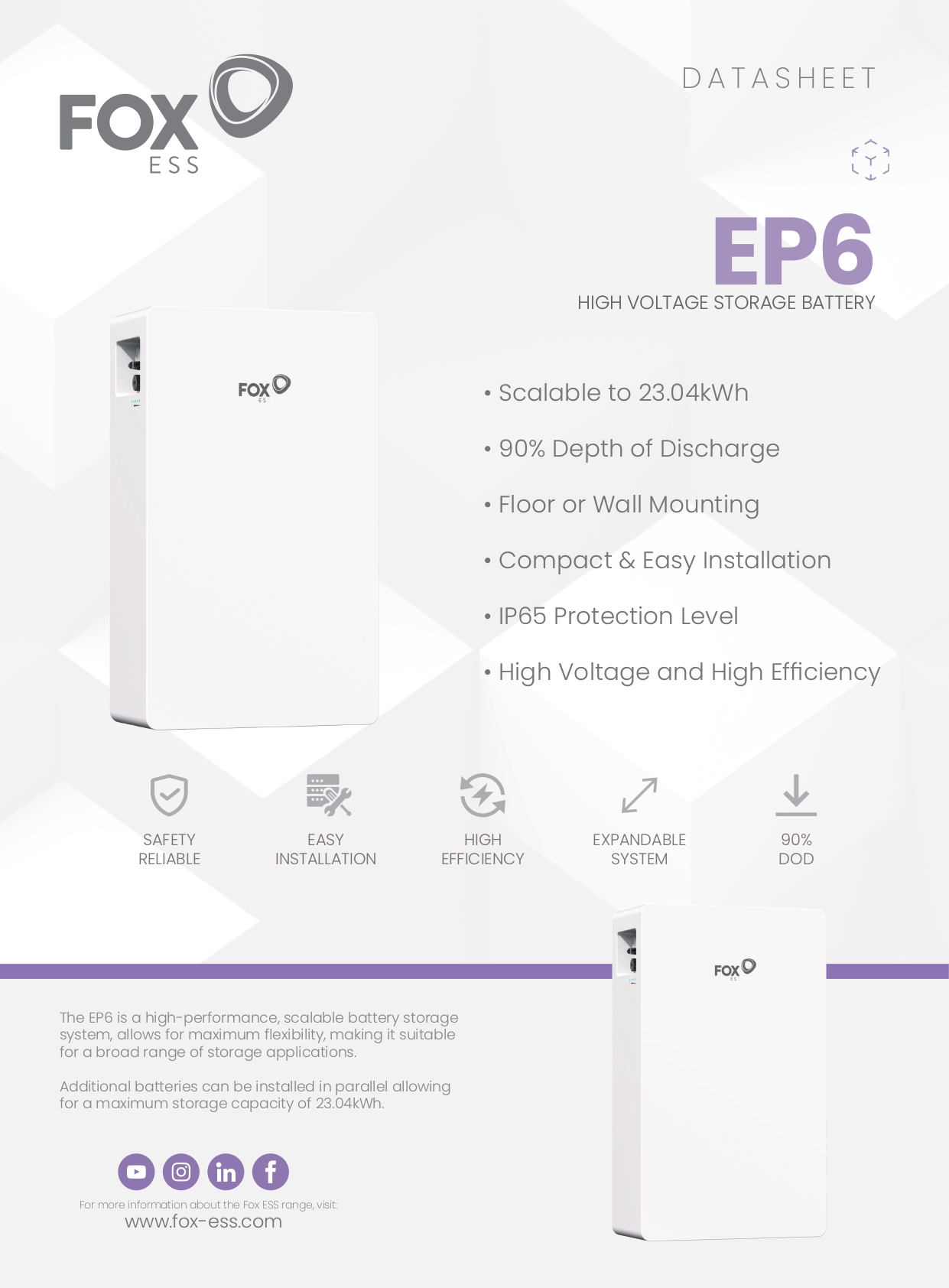 Rovnako ako v prípade EP6 sa na zaručenie bezpečnosti a odolnosti používa technológia LiFePO4 a premyslená konštrukcia systému umožňuje rýchlu inštaláciu a rozšírenie. Batéria je odolná voči vonkajším podmienkam (IP65), má prirodzené konvekčné chladenie a rad pokročilých bezpečnostných funkcií. Komunikácia CAN/LED umožňuje plné monitorovanie systému z platformy Fox Cloud 2.0 – špecializovanej aplikácie na riadenie, analýzu a plánovanie práce s využitím dynamických taríf.