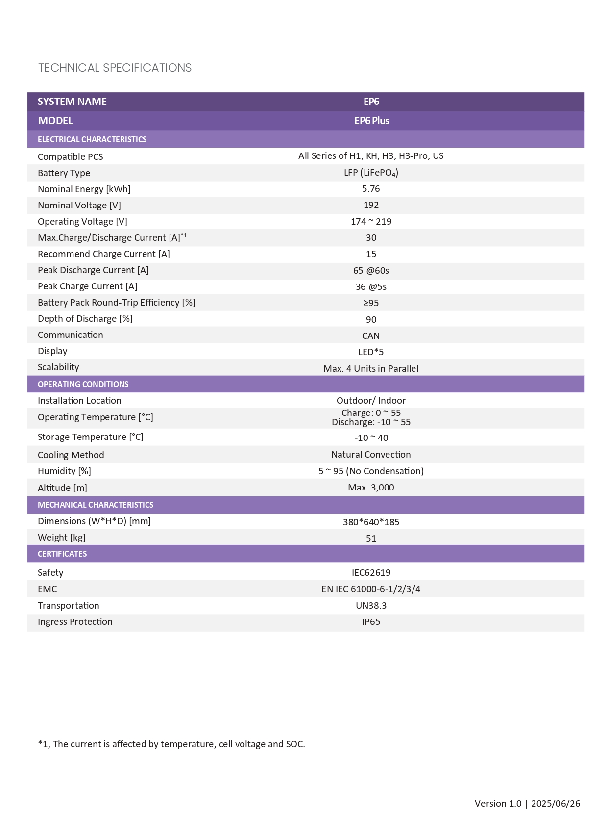 Batéria EP6 využíva technológiu LiFePO4, ktorá sa vyznačuje mimoriadne vysokou životnosťou (minimálne 4 000 cyklov) a prevádzkovou bezpečnosťou. Krytie IP65 umožňuje inštaláciu vonku aj vo vnútri a dobre navrhnutá konštrukcia umožňuje rýchlu inštaláciu (na podlahu alebo na stenu) a rozšírenie bez použitia skrutiek. Systém podporuje pokročilé komunikačné rozhrania (CAN), pôsobivý LED displej a prirodzené konvekčné chladenie.