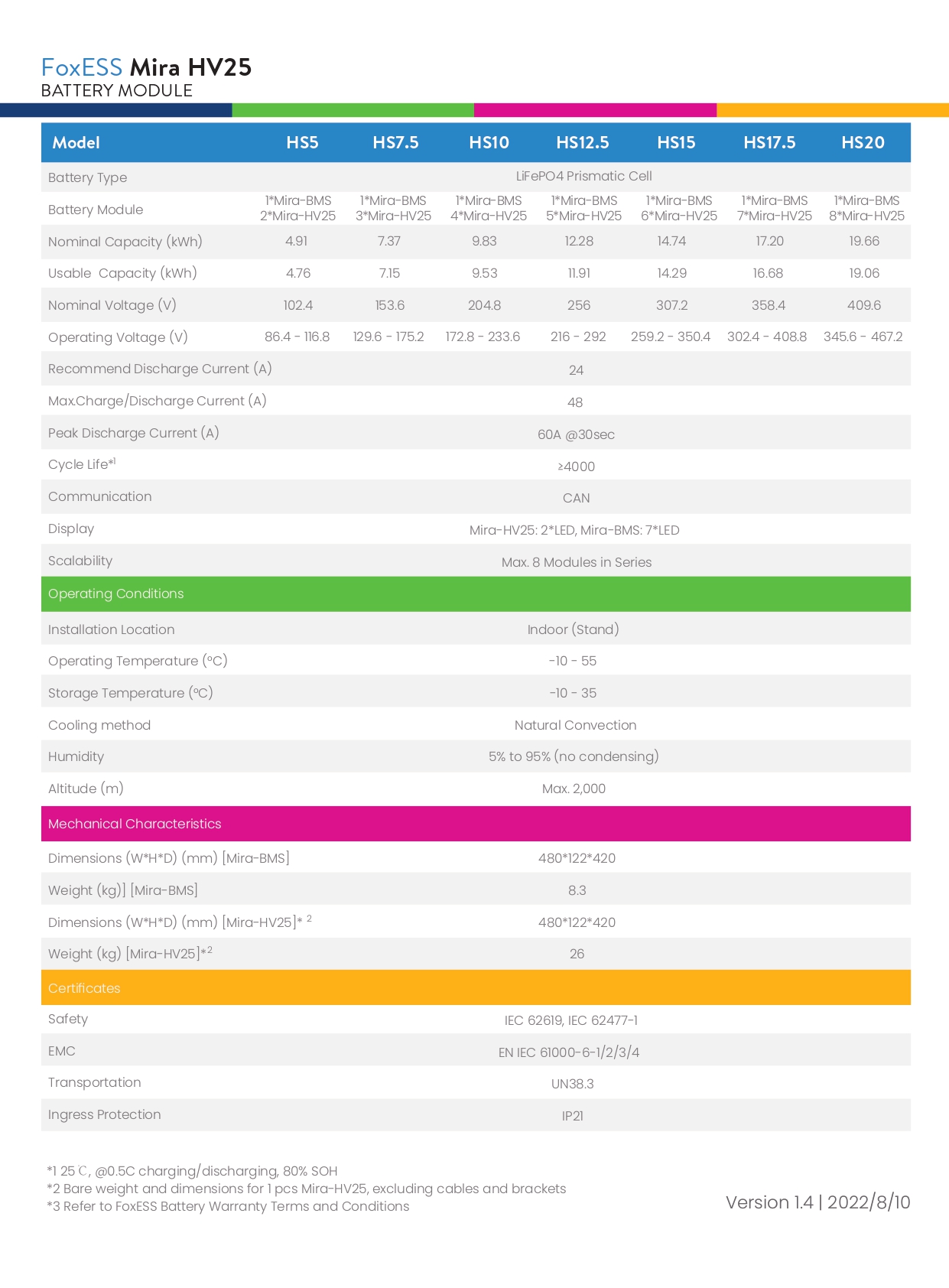 Pri každodennom používaní je batéria FoxESS MIRA HV2500 prakticky bezúdržbová. Jej kompaktné rozmery (cca 122 x 420 x 480 mm) a hmotnosť (cca 26 kg) umožňujú jednoduchú inštaláciu na stenu alebo do skrine na ukladanie energie a jej vysoká energetická účinnosť umožňuje rýchle nabíjanie (až 48 A) a efektívne uvoľňovanie uloženej energie. Na modul sa vzťahuje 10-ročná záruka výrobcu, ktorá používateľovi umožňuje mnoho rokov bezproblémovej prevádzky s plnou servisnou podporou.